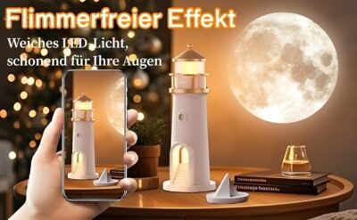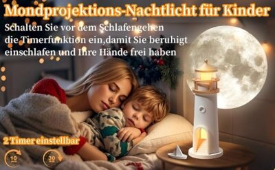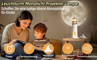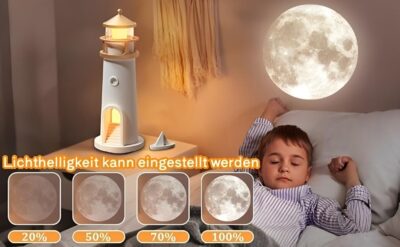 Fascinating Moon Projection The lighthouse projects beautiful moonlight, transforming any room into a quiet night sky. This lighthouse lamp is ideal for bedrooms, children’s rooms or living rooms and creates a magical and relaxing atmosphere.